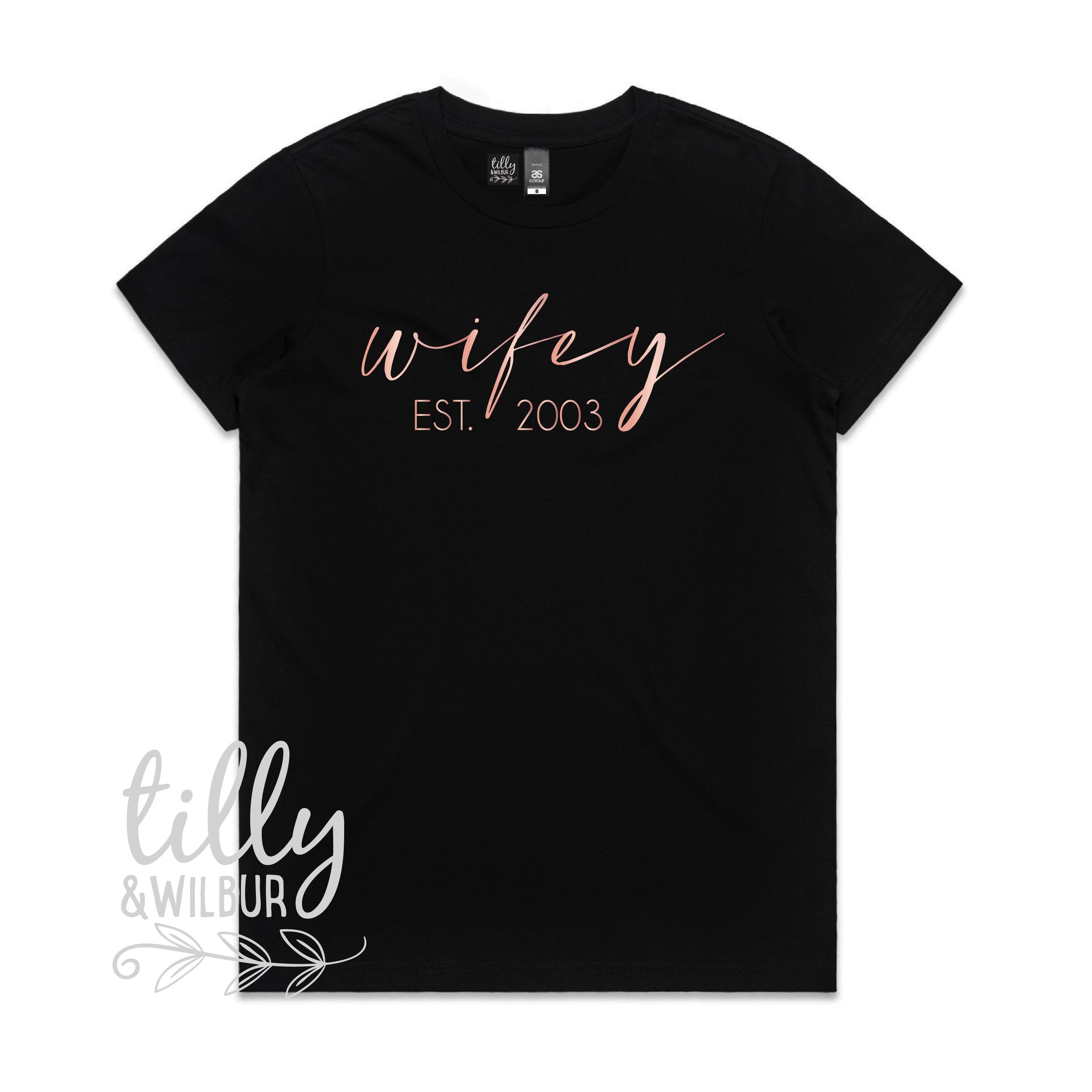 • Wifey Est. T-Shirt For New Bride, Wifey Tee, Newlyweds, Rose Gold Print, Honeymoon Outfits, Wife Gift, Wedding Gift, His and Hers Clothing,